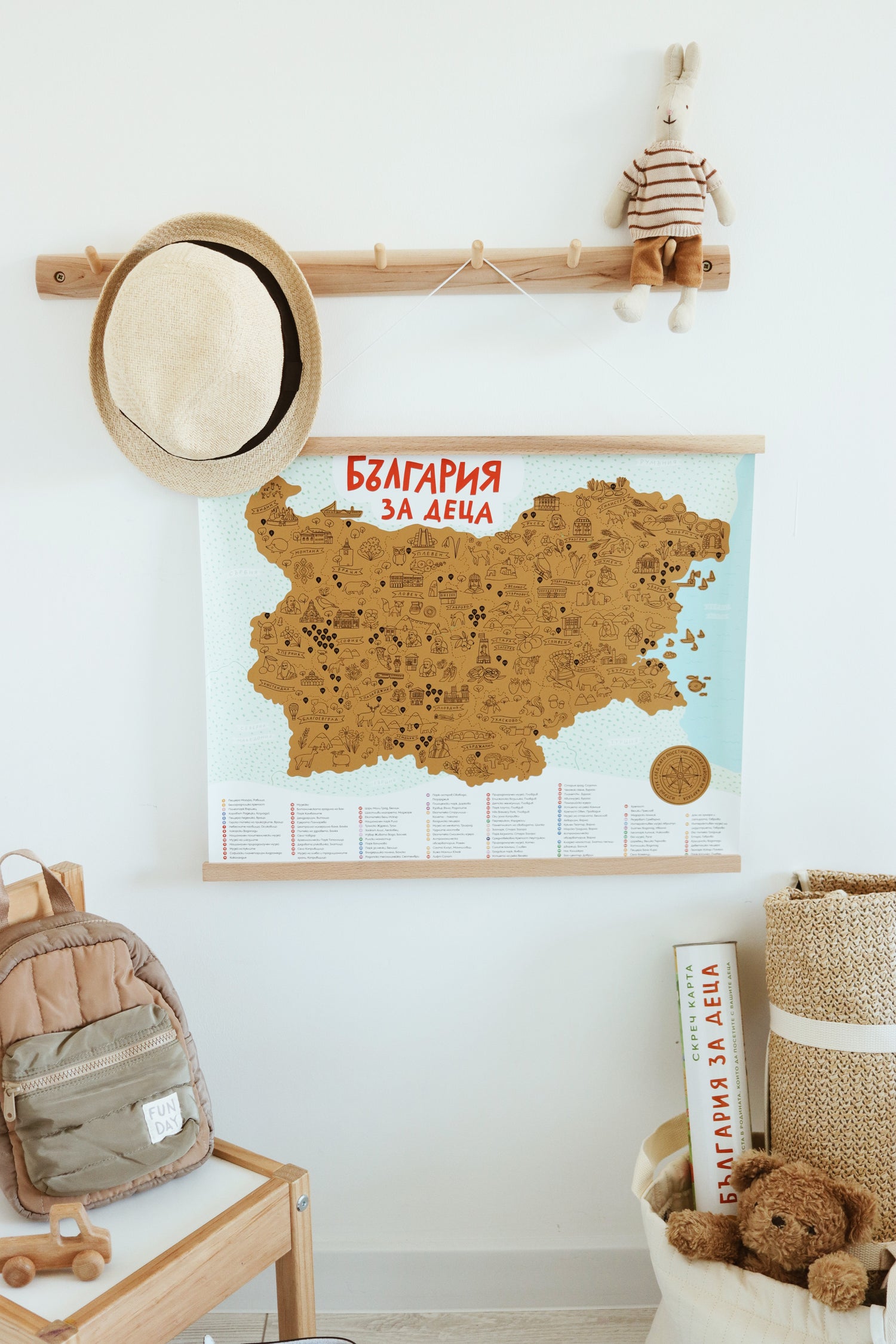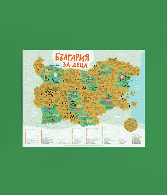 Скреч карта със 100 места в България, които си заслужава да посетите с вашите деца. Под скреч фолиото се разкриват цветни илюстрации на характерни за всяка област забележителности, културни и природни богатства, флора и фауна, както и знаменити българи.