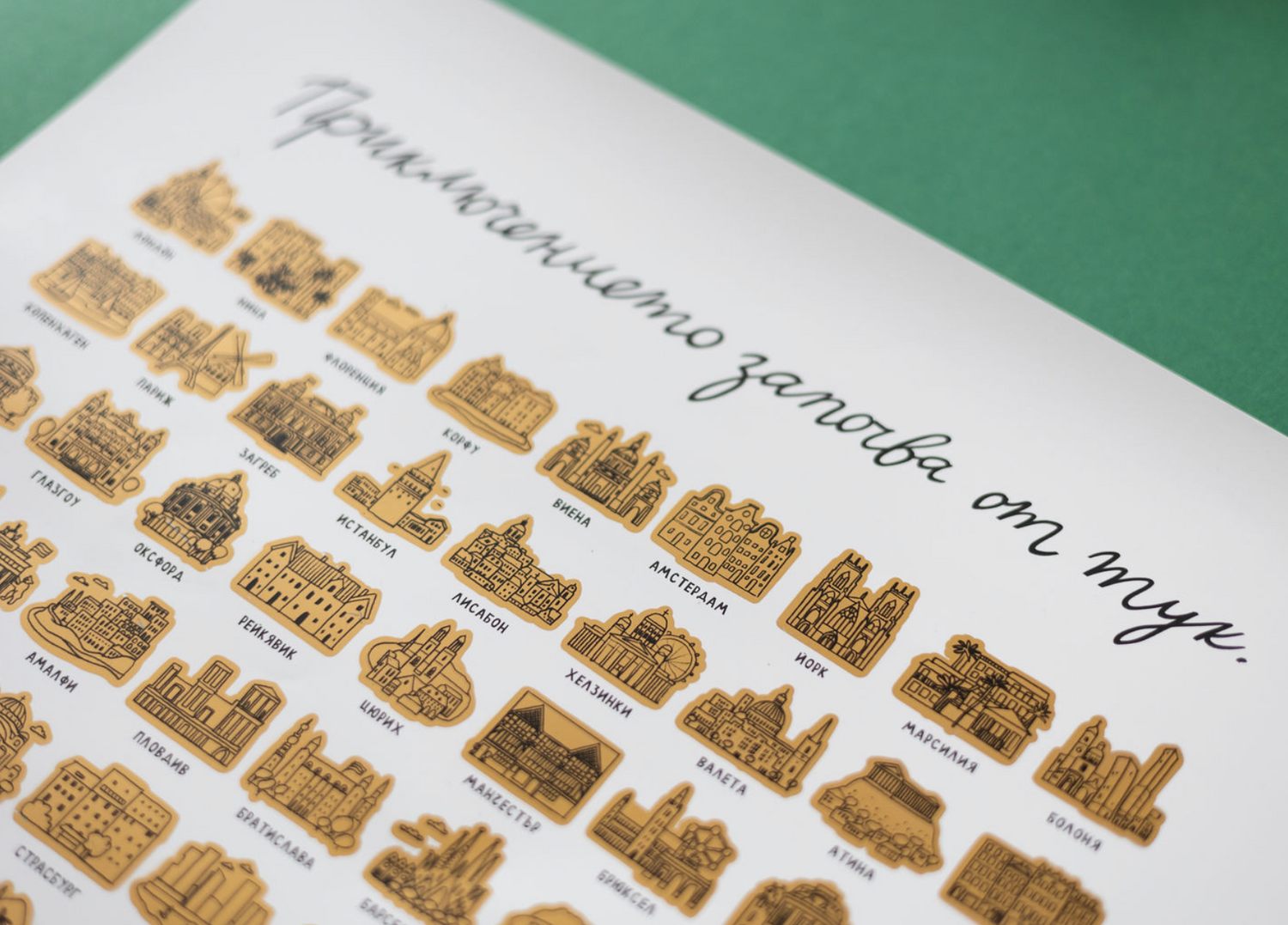 Отбележете пътуванията си с нашата скреч карта с 90 авторски илюстрации на най-интересните градове в Европа.